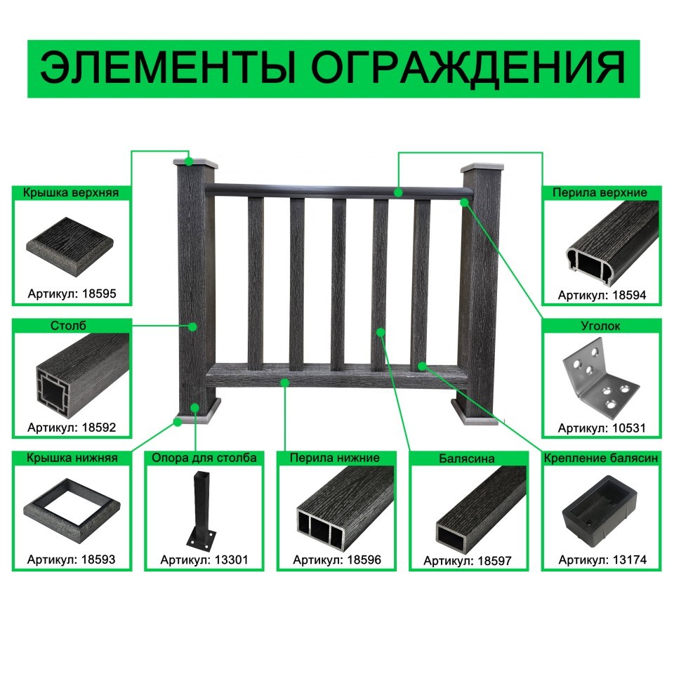 Изделия из ДПК изготовлены из практичного и качественного материала - древесно-полимерного композита, при создании которого используется собственная рецептура и самые современные наработки в области переработки полимеров.