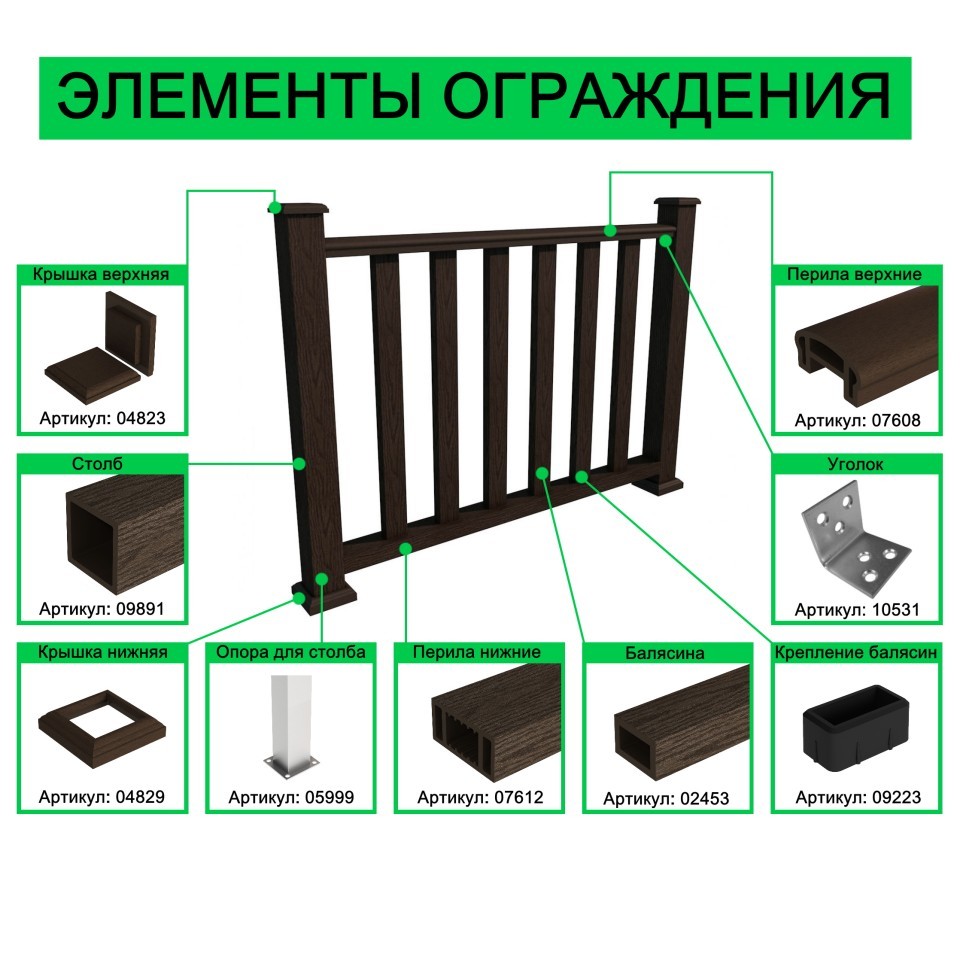 Изделия из ДПК изготовлены из практичного и качественного материала - древесно-полимерного композита, при создании которого используется собственная рецептура и самые современные наработки в области переработки полимеров.